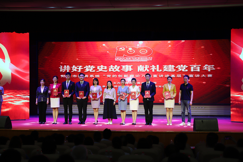 為慶祝中國(guó)共產(chǎn)黨成立100周年, 扎實(shí)開(kāi)展黨史學(xué)習(xí)教育,5月26日上午,鄭州市國(guó)資系統(tǒng)“講好黨史故事·獻(xiàn)禮建黨百年”——“黨的創(chuàng)新理論萬(wàn)場(chǎng)宣講進(jìn)基層”宣講大賽在市總工會(huì)一樓職工大禮堂圓滿落下帷幕。來(lái)自市國(guó)資系統(tǒng)14家單位選送的15個(gè)宣講節(jié)目進(jìn)入大賽決賽,鄭州地產(chǎn)集團(tuán)選送的西流湖公司黨支部宣講節(jié)目《百年交響》榮獲三等獎(jiǎng)。
