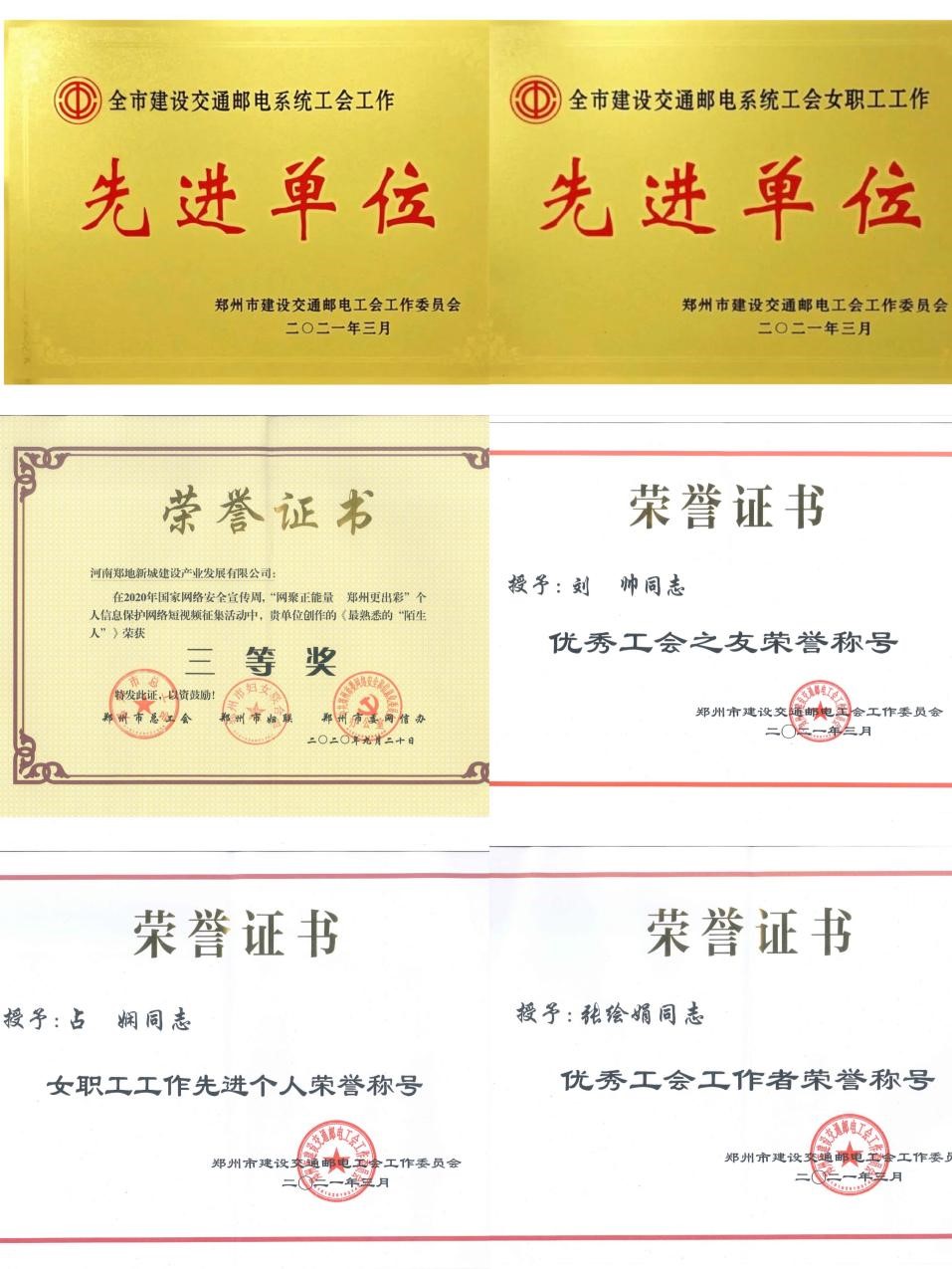 2021年3月22日,經(jīng)鄭州市建設交通郵電工會工作委員會研究決定,授予我公司工會鄭州市建設交通郵電系統(tǒng)“2020年度工會工作先進單位”和“2020年度女職工工作先進單位”榮譽稱號,并授予劉帥同志鄭州市建設交通郵電系統(tǒng)“2020年度工會之友”榮譽稱號,新城公司工會的占嫻和張繪娟兩位同志分別被評選為“優(yōu)秀工會女職工工作”和“優(yōu)秀工會工作者”先進個人。