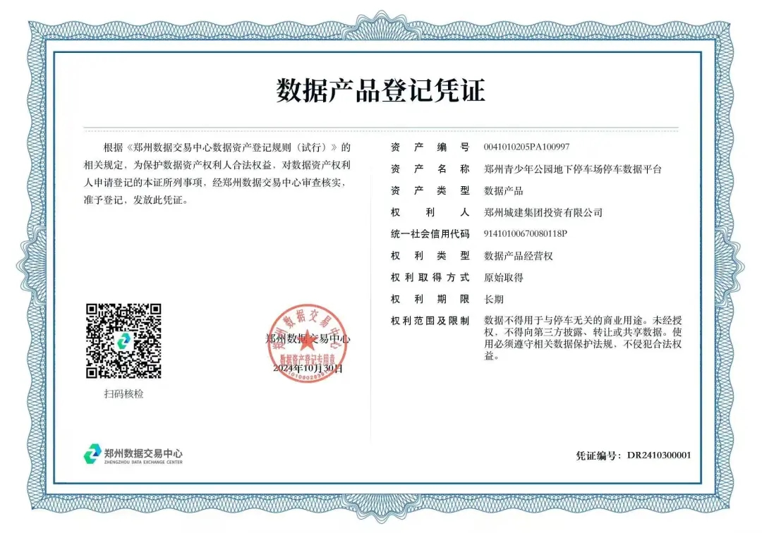 10月30日,城發(fā)集團(tuán)下屬子公司鄭州城建集團(tuán)投資有限公司(以下簡(jiǎn)稱(chēng)“城建集團(tuán)”)在鄭州數(shù)據(jù)交易中心成功完成了“鄭州青少年公園地下停車(chē)場(chǎng)停車(chē)數(shù)據(jù)平臺(tái)”數(shù)據(jù)產(chǎn)品的資產(chǎn)登記,喜獲數(shù)據(jù)產(chǎn)品登記憑證,成為鄭州市首家將停車(chē)數(shù)據(jù)資產(chǎn)入表的國(guó)有企業(yè)。