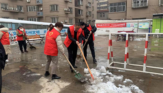 昨晚,鄭州市迎來(lái)了牛年第一場(chǎng)雪,小區(qū)活動(dòng)場(chǎng)地已披上一層皚皚白雪,為方便小區(qū)居民通行,志愿者們拿著鐵鍬、掃把清理廣場(chǎng)上的積雪,經(jīng)過(guò)大家的努力,積雪被清理干凈。