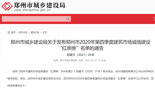 2月25日,鄭州市城鄉(xiāng)建設(shè)局發(fā)布鄭州市2020年第四季度建筑市場誠信建設(shè)“紅黑榜”名單的通告(鄭建文〔2021〕28號),鄭州地產(chǎn)集團(tuán)投資管理有限公司榮登“紅榜”單位,趙玨榮登“紅榜”個人。