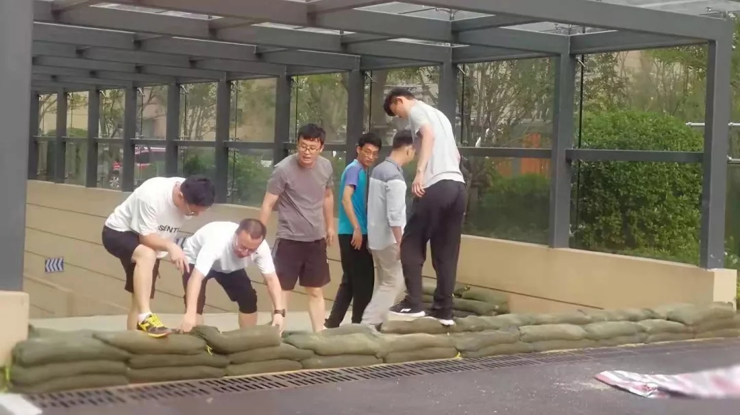 在金岱科創(chuàng)城鄭地發(fā)展公司市政道路提升改造現(xiàn)場,公司負責人帶隊檢查每條道路的沙袋、隔離護欄等防汛措施準備情況。在金岱科創(chuàng)城商務(wù)服務(wù)中心,針對下沉庭院等有深基坑可能發(fā)生嚴重積水內(nèi)澇的點位,公司提前謀劃,協(xié)調(diào)發(fā)電機和水泵并安裝調(diào)試到位,確保一旦發(fā)生停電積水等極端情況,立即進行抽排。在商務(wù)服務(wù)中心一樓大廳,公司將LED大屏等電子信息設(shè)備進行防水覆蓋,同時對可能發(fā)生滲水的部位進行排查加固,確保公司重要資產(chǎn)不受損失。